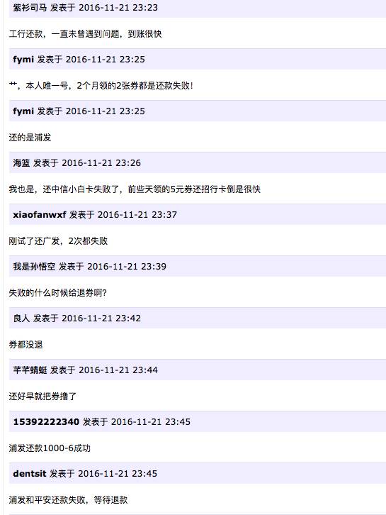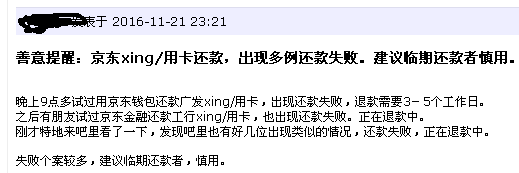 互聯(lián)網(wǎng)金融新聞中心注意到,上述網(wǎng)友所述情況并非個(gè)例。有網(wǎng)友表示,曾多次試過用京東錢包還廣發(fā)銀行信用卡,出現(xiàn)還款失敗,退款需要3-5個(gè)工作日。之后有朋友嘗試還工商銀行信用卡,也出現(xiàn)還款失敗的情況。