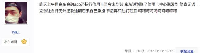 還有不少網(wǎng)友提到,用京東金融還信用卡到賬時(shí)間過長!霸缟线的招行,2個(gè)小時(shí)還未到賬。”“還招行信用卡至今未到賬,京東說到賬了,信用卡中心說未到。京東方面讓自行解決,還款逾期后果要自己承擔(dān)!