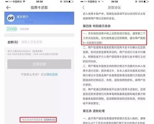 互聯(lián)網(wǎng)金融新聞中心嘗試通過京東金融APP對信用卡進(jìn)行還款,設(shè)置完成時(shí)間過去一小時(shí)后仍顯示還款中,未能實(shí)現(xiàn)即時(shí)到帳。而后,互聯(lián)網(wǎng)金融新聞中心查閱京東金融APP還款協(xié)議時(shí),在特別提示條款中發(fā)現(xiàn),協(xié)議表示,“京東錢包信用卡網(wǎng)上還款完成付款后,通常第二個(gè)工作日到賬!