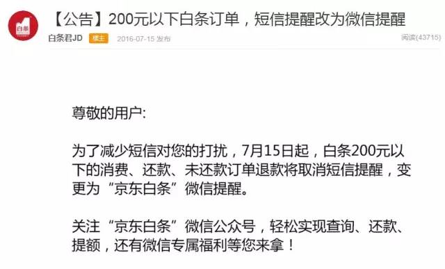 此外,京東白條2016年7月15日發(fā)布公告稱,白條200元以下的消費(fèi)、還款、未還款訂單退款將取消短信提醒,變?yōu)椤熬〇|白條“微信提醒。