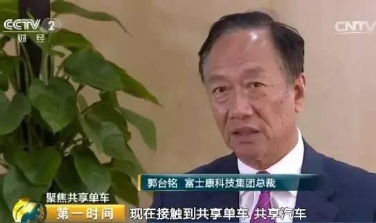 富士康科技集團總裁 郭臺銘: 就是現(xiàn)在接觸到共享單車、共享汽車,進入到這些很多的網絡的,等于說硬件和軟件要結合的時代,所以說富士康做到這個就蠻重要的。我們在制造的領域,在設計開發(fā)的領域,可以把這家公司很快地讓它有一個市場占有率。