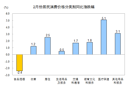 2月份,其他七大類價(jià)格同比均有所上漲。其中,醫(yī)療保健、其他用品和服務(wù)、居住、教育文化和娛樂、交通和通信、衣著、生活用品及服務(wù)價(jià)格分別上漲5.1%、3.1%、2.5%、1.8%、1.7%、1.2%和0.5%。