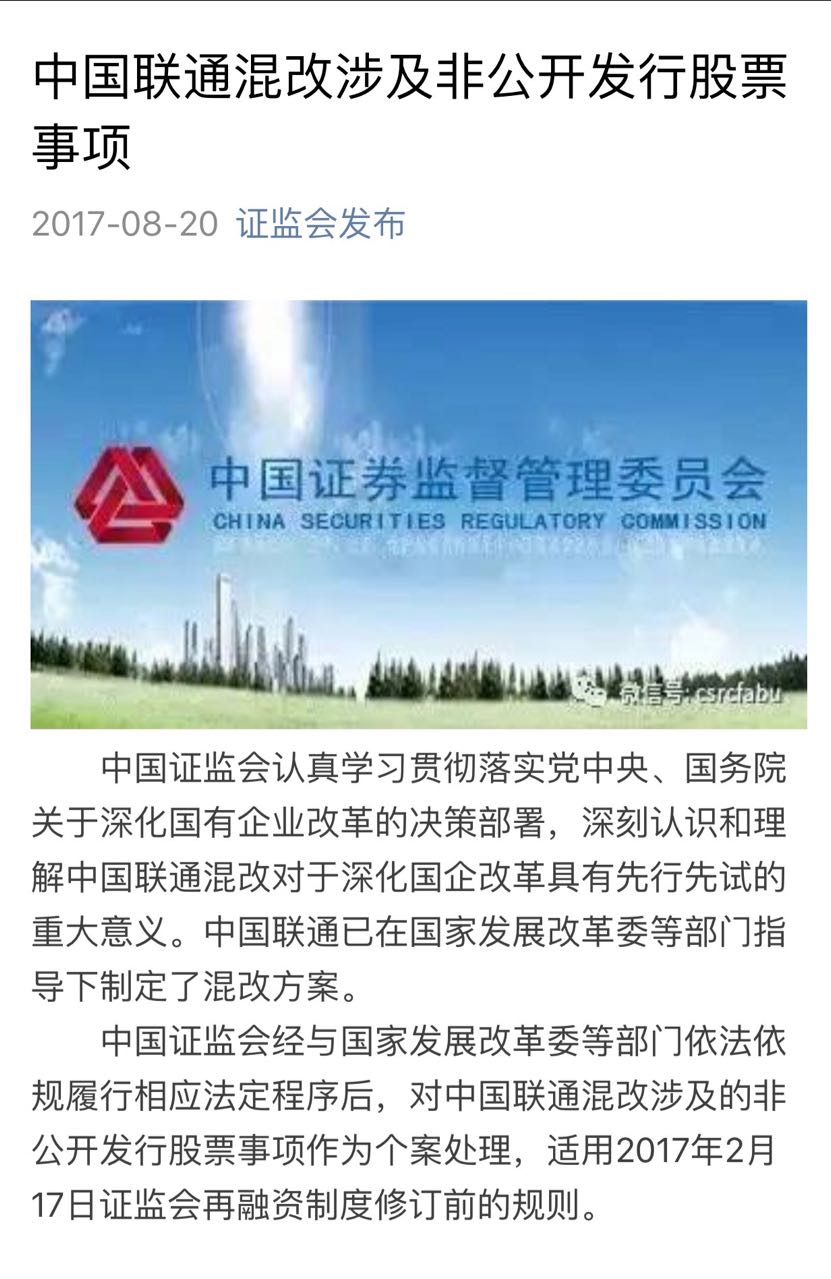 央廣網(wǎng)8月21日消息 20日晚間,中國證監(jiān)會(huì)官網(wǎng)就中國聯(lián)通混改以及非公開發(fā)行股票一事發(fā)布公告:中國證監(jiān)會(huì)經(jīng)與國家發(fā)展改革委等部門依法依規(guī)履行相應(yīng)法定程序后,對(duì)中國聯(lián)通混改涉及的非公開發(fā)行股票事項(xiàng)作為個(gè)案處理,適用2017年2月17日證監(jiān)會(huì)再融資制度修訂前的規(guī)則。