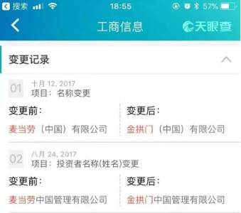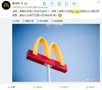10月25日晚間,麥當(dāng)勞企業(yè)名稱(chēng)變更的消息引爆輿論熱潮。工商信息數(shù)據(jù)顯示:10月12日,麥當(dāng)勞(中國(guó))已正式變更為"金拱門(mén)(中國(guó))有限公司"。并就上述名稱(chēng)變更取得了新的營(yíng)業(yè)執(zhí)照。而后,麥當(dāng)勞(中國(guó))證明了這一消息的真實(shí)性。