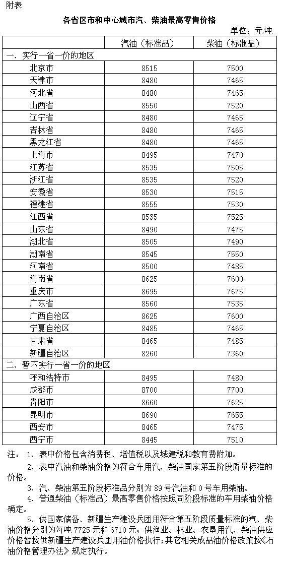 調(diào)整后,各省(區(qū)、市)和中心城市汽、柴油最高零售價格見附表。相關(guān)價格聯(lián)動及補(bǔ)貼政策按現(xiàn)行規(guī)定執(zhí)行。