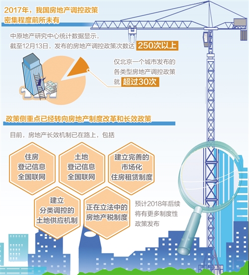 我國在過去20年房地產(chǎn)調(diào)控中,從來沒有一次調(diào)控政策密集發(fā)布程度接近2017年。在“房住不炒”和嚴控房價的決心下,調(diào)控在短期內(nèi)取得了明顯效果。但歷史上每一輪調(diào)控的經(jīng)驗顯示,要保障房地產(chǎn)市場的長期穩(wěn)定運行,必須盡快建立調(diào)控長效機制。住房和城鄉(xiāng)建設部部長王蒙徽日前表示,“下一步將加快住房制度改革和房地產(chǎn)長效機制建設,保持房地產(chǎn)市場的平穩(wěn)健康發(fā)展”。無疑,2018年將成為房地產(chǎn)長效機制取得突破的關(guān)鍵一年。