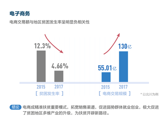電商在拓寬農(nóng)產(chǎn)品銷售渠道,幫助弱勢(shì)群體創(chuàng)業(yè)就業(yè),產(chǎn)業(yè)扶貧方面正在發(fā)揮不可替代的作用。以北川縣為例,當(dāng)?shù)仉娚探灰滓?guī)模從2015年的55.01億增加到2017年的130億元的同時(shí),貧困發(fā)生率從12.3%降到了4.66%,電商精準(zhǔn)脫貧的牽引作用明顯。