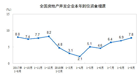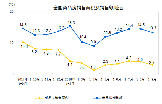 央廣網(wǎng)北京10月19日消息,國(guó)家統(tǒng)計(jì)局今日發(fā)布2018年1-9月份全國(guó)房地產(chǎn)開發(fā)投資和銷售情況。數(shù)據(jù)顯示,2018年1-9月份,全國(guó)房地產(chǎn)開發(fā)投資88665億元,同比增長(zhǎng)9.9%,增速比1-8月份回落0.2個(gè)百分點(diǎn);商品房銷售面積119313萬(wàn)平方米,同比增長(zhǎng)2.9%,增速比1-8月份回落1.1個(gè)百分點(diǎn);1-9月份,房地產(chǎn)開發(fā)企業(yè)到位資金121882億元,同比增長(zhǎng)7.8%,增速比1-8月份提高0.9個(gè)百分點(diǎn)。