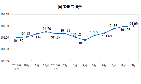 9月份,房地產(chǎn)開發(fā)景氣指數(shù)(簡(jiǎn)稱“國(guó)房景氣指數(shù)”)為101.99,比8月份提高0.01點(diǎn)。