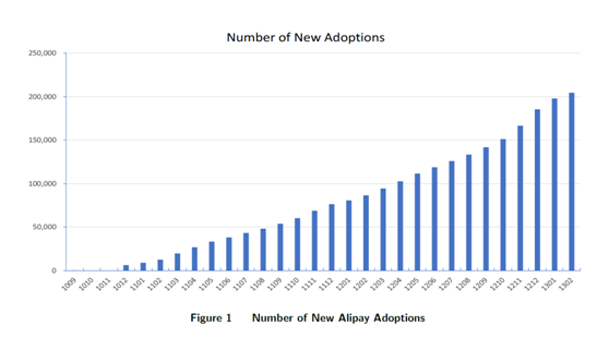 (圖1顯示,在觀(guān)察周期內(nèi),每月新接受支付寶的消費(fèi)者數(shù)量?梢钥吹剑瑥2010年10月開(kāi)始,新接受支付寶的消費(fèi)者總數(shù)穩(wěn)步增長(zhǎng)。2013年,新接受支付寶的消費(fèi)者人數(shù)增長(zhǎng)至204547人,占樣本的13.3%。這表明移動(dòng)支付正越來(lái)越普及。)