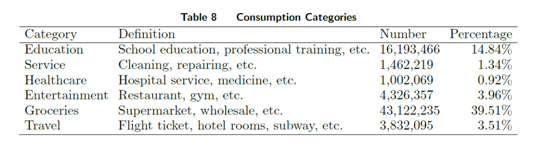 (上表顯示了移動(dòng)支付交易過(guò)程中不同品類(lèi)在全部交易的占比,其中教育14.84%,家政服務(wù)1.34%,醫(yī)療健康0.92%,娛樂(lè) 3.96%,食品百貨39.51%,旅行3.51%。)