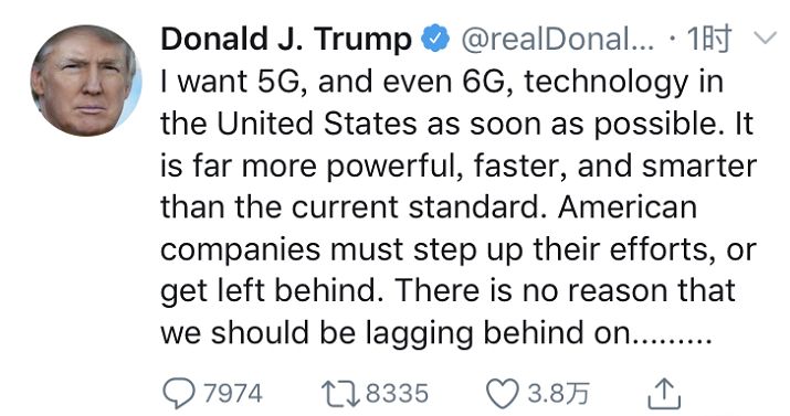 我希望美國(guó)盡可能快地發(fā)展5G,甚至6G技術(shù),那會(huì)比當(dāng)前的標(biāo)準(zhǔn)更強(qiáng)、更快、更智能。美國(guó)公司必須加緊努力,否則就會(huì)落后。在那些明顯代表未來(lái)的領(lǐng)域,美國(guó)沒(méi)有被人甩在身后的理由。我希望美國(guó)公司能夠通過(guò)競(jìng)爭(zhēng)去獲勝,而不是靠封殺當(dāng)下更先進(jìn)的技術(shù)。不論在我們從事的哪個(gè)領(lǐng)域,美國(guó)都必須是領(lǐng)導(dǎo)者,尤其是在令人興奮的科技世界!