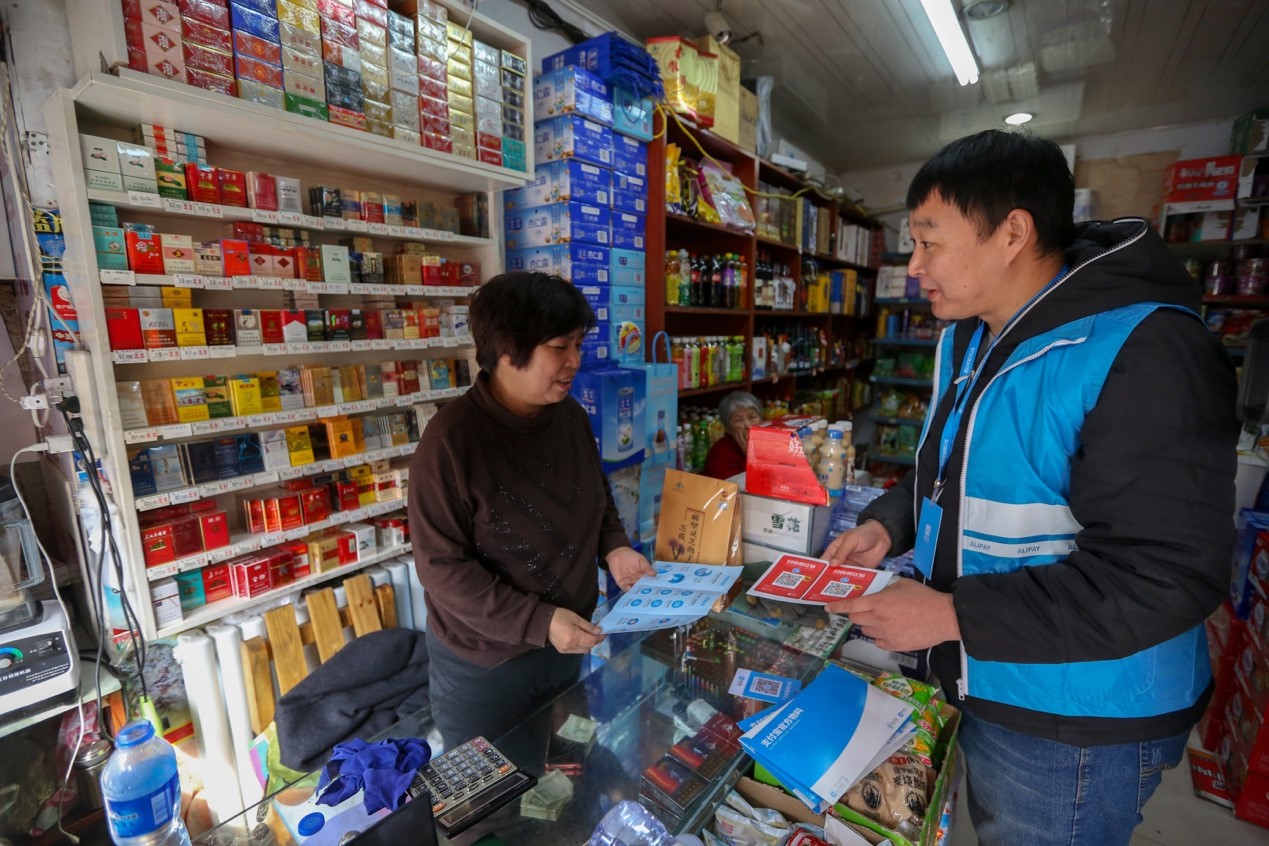 老板不用問其實(shí)也知道他的來意,陳世龍的藍(lán)色馬甲上就印著: 歡迎使用支付寶。