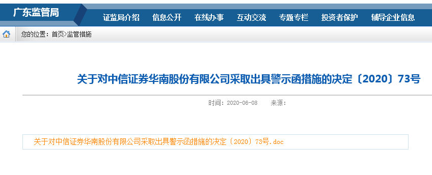 8日,廣東證監(jiān)局網(wǎng)站公布行政監(jiān)管措施決定書,對中信證券華南股份有限公司(以下簡稱“中信證券華南”)出具警示函。