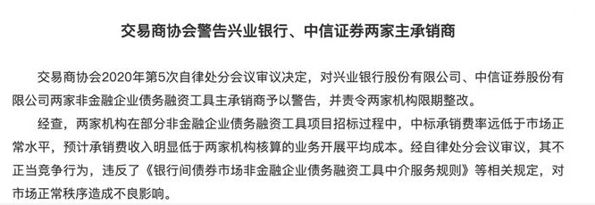 據(jù)交易商協(xié)會網(wǎng)站消息,5月15日,交易商協(xié)會發(fā)布2020年第5次自律處分會議審議決定,對興業(yè)銀行股份有限公司、中信證券股份有限公司兩家非金融企業(yè)債務融資工具主承銷商予以警告,并責令兩家機構限期整改。
