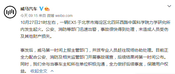 據(jù)威馬汽車科技集團有限公司微博,10月27日21時左右,一輛EX5于北京市海淀區(qū)北四環(huán)西路中國科學(xué)院力學(xué)研究所內(nèi)發(fā)生起火。公安、消防等部門迅速出警,事故很快得到處理,未造成人員受傷及其他財產(chǎn)損失。