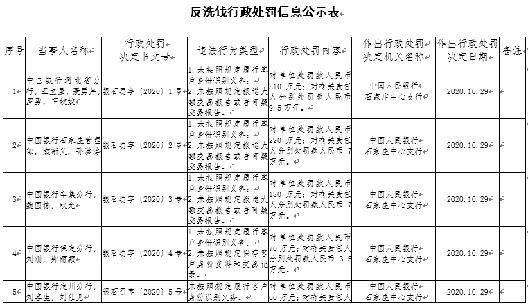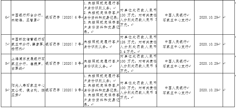 除了上述機(jī)構(gòu),公示表顯示,因中國郵政儲蓄銀行石家莊市分行及有關(guān)負(fù)責(zé)人未按照規(guī)定履行客戶身份識別義務(wù),監(jiān)管部門對單位處罰款126萬元,對兩位有關(guān)責(zé)任人分別處罰款3.4萬元;因上海浦東發(fā)展銀行石家莊分行及有關(guān)負(fù)責(zé)人未按照規(guī)定履行客戶身份識別義務(wù),監(jiān)管部門對單位處罰款100萬元,對兩位有關(guān)責(zé)任人分別處罰款5萬元。