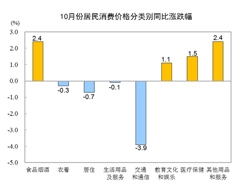 10月份,全國居民消費價格環(huán)比下降0.3%。其中,城市下降0.3%,農村下降0.5%;食品價格下降1.8%,非食品價格上漲0.1%;消費品價格下降0.6%,服務價格上漲0.1%。