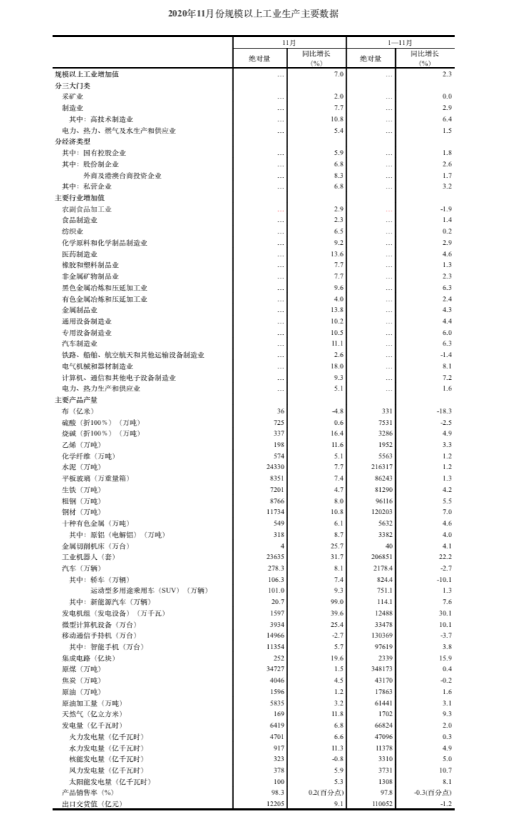 分三大門類看,11月份,采礦業(yè)增加值同比增長2.0%,增速較10月份放緩1.5個(gè)百分點(diǎn);制造業(yè)增長7.7%,加快0.2個(gè)百分點(diǎn);電力、熱力、燃?xì)饧八a(chǎn)和供應(yīng)業(yè)增長5.4%,加快1.4個(gè)百分點(diǎn)。