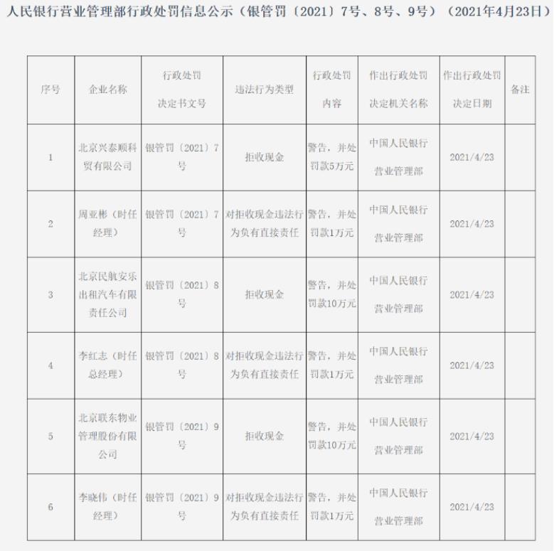 4月23日,中國人民銀行營業(yè)管理部一口氣開出6張罰單,均與拒收現(xiàn)金有關(guān)!