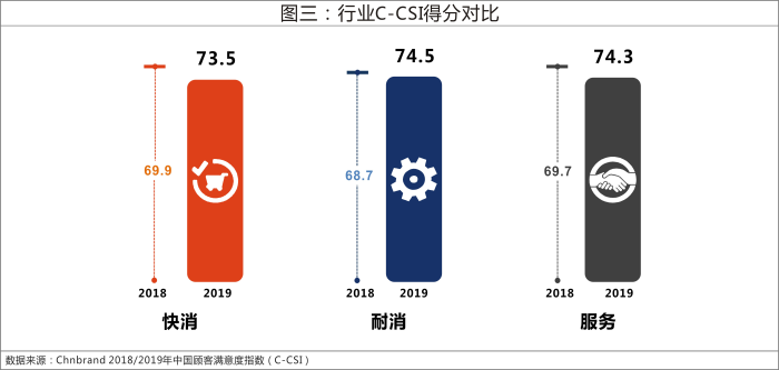 央廣網(wǎng)北京10月23日消息(記者呂紅橋)品牌評(píng)級(jí)機(jī)構(gòu)Chnbrand22日發(fā)布2019年(第五屆)中國(guó)顧客滿意度指數(shù) (C-CSI)品牌排名和分析報(bào)告。本年度C-CSI得分74.0分,在歷經(jīng)兩年的連續(xù)回落后,呈現(xiàn)上升趨勢(shì)。其中,耐消品行業(yè)得分最高,為74.5分;服務(wù)業(yè)得分為74.3分;快消品行業(yè)得分最低,為73.5分。