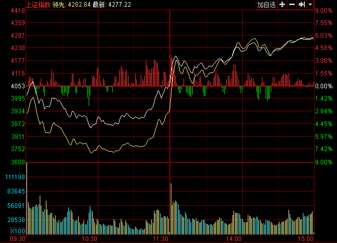 截止收盤,滬指報4277.22點,漲224.19點,漲幅5.53%;深成指報14337.97點,漲771.69點,漲幅5.69%;創(chuàng)業(yè)板報2858.61點,漲6.28點,漲幅%。