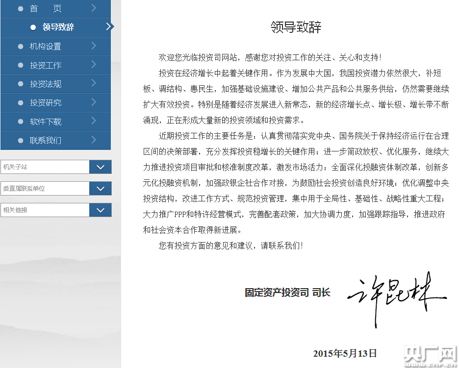 在發(fā)改委投資司的網(wǎng)頁上,許昆林發(fā)表了“領(lǐng)導(dǎo)致辭”,全文如下: