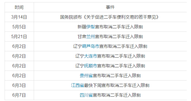 因此,今年3月,國(guó)務(wù)院發(fā)布《關(guān)于促進(jìn)二手車便利交易的若干意見》,明確要求除有特殊要求的城市外,其他省市要在5月底徹底完成解除限遷的落地實(shí)施。