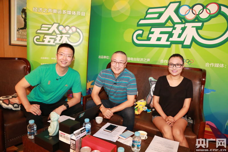 主持人王冠、財經(jīng)評論人水皮和央視女主播王曦梁一起暢聊奧運(央廣記者安健 攝)