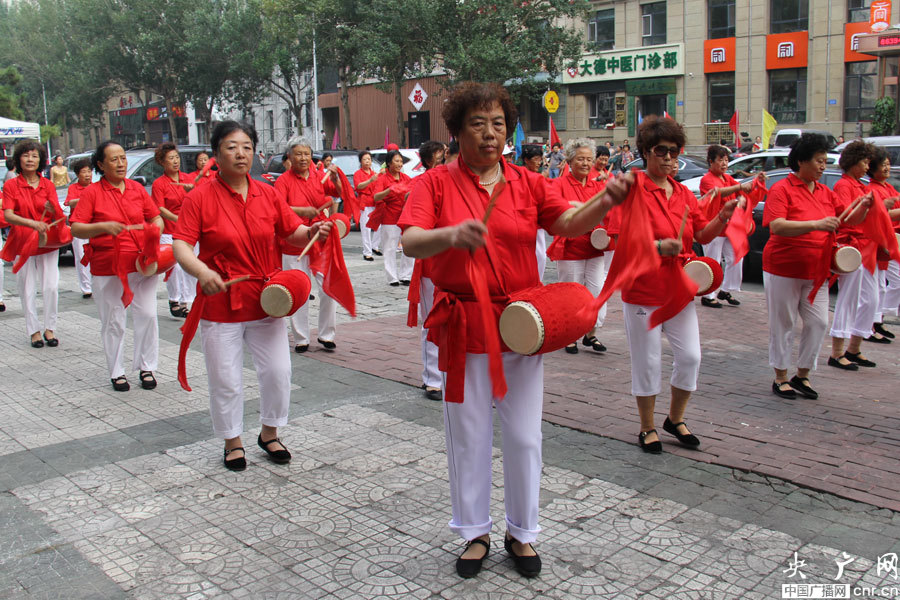餐飲街上歡快打鼓的大媽們 李靜/攝