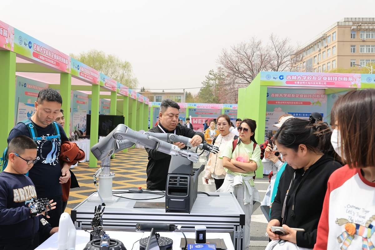 本屆杏花文化節(jié)以“繁花初綻·杏好有你”為主題,致力于打造全天候的沉浸式體驗。除開幕式及文藝展演外,學(xué)校還精心安排了13個專題展區(qū)。在大學(xué)生科技創(chuàng)新作品展區(qū),機(jī)器人的書法表演、仿生機(jī)器狗的靈動互動,讓孩子們目不轉(zhuǎn)睛;吉大校友企業(yè)科技創(chuàng)新展區(qū)則集中展示了40余家校友企業(yè)在智能制造、人工智能等前沿領(lǐng)域的創(chuàng)新成果,彰顯了吉大人才與產(chǎn)業(yè)的深度融合。