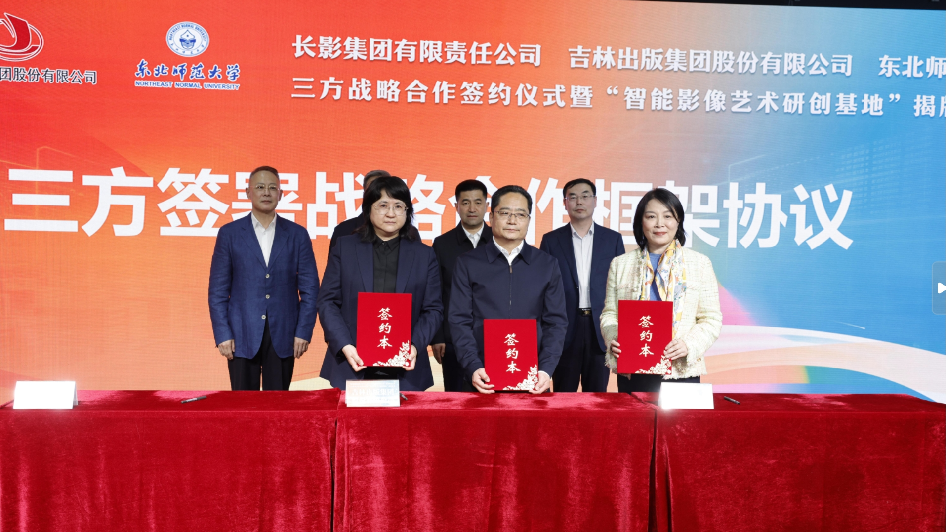 央廣網(wǎng)長春4月21日消息(記者張學龍)21日,長影集團有限責任公司、吉林出版集團股份有限公司、東北師范大學三方戰(zhàn)略合作簽約暨“智能影像藝術(shù)研創(chuàng)基地”揭牌儀式,在東北師范大學傳媒科學學院(新聞學院)圓滿舉行。這是深入落實吉林省國家文化數(shù)字化戰(zhàn)略、深化產(chǎn)教融合、培育文化產(chǎn)業(yè)新質(zhì)生產(chǎn)力的標志性實踐,三方以資源互補、目標同向、協(xié)同共進為核心,構(gòu)建“內(nèi)容+影視+科技+教育”全鏈條融合體系,為吉林文化強省建設(shè)注入強勁新動能。