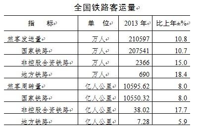 2013年鐵路旅客發(fā)送量較上年增長10.8%
