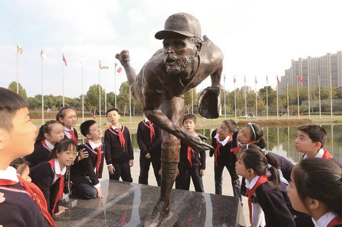 小學生在老師的帶領下參觀展覽館外不同國家的主題雕塑。 本報記者 宋 寧攝