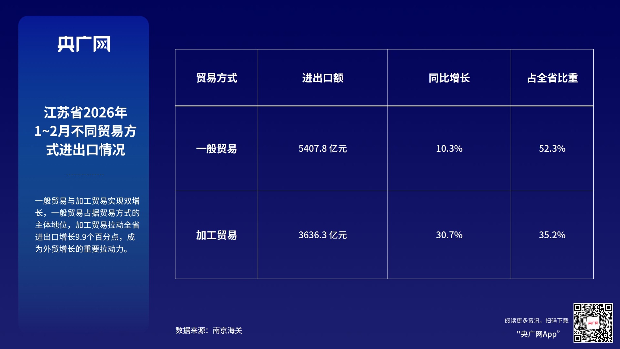 江蘇省2026年1~2月不同貿(mào)易方式進出口情況(央廣網(wǎng)發(fā) 王宣宣制圖)
