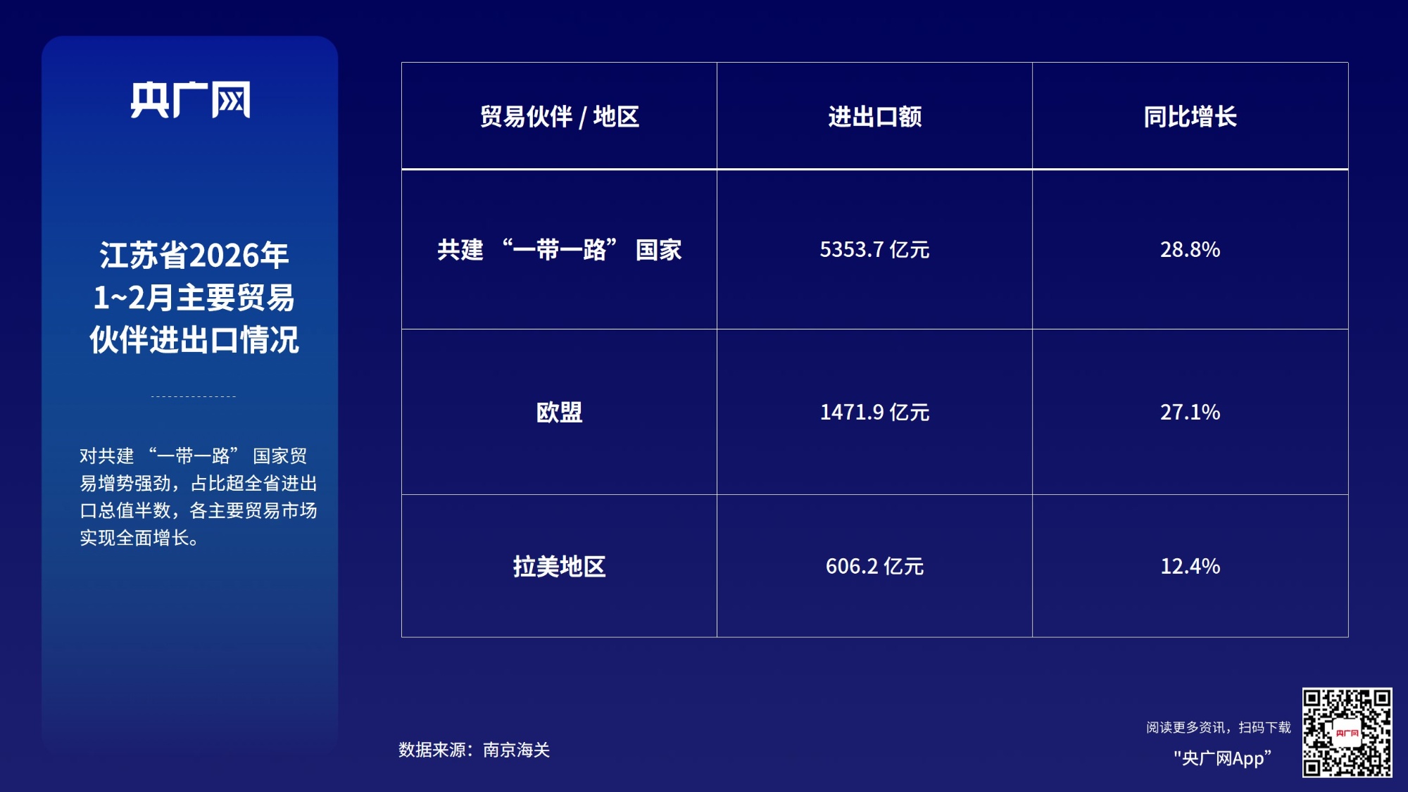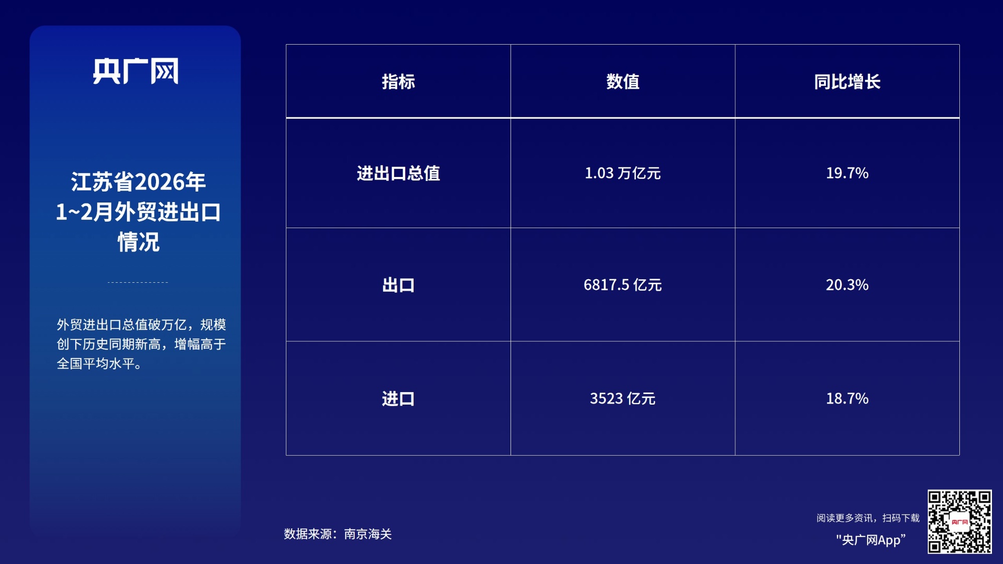 央廣網(wǎng)南京3月18日消息(記者呂倩媛)南京海關(guān)最新統(tǒng)計數(shù)據(jù)顯示,2026年前2個月,江蘇省外貿(mào)進出口總值達1.03萬億元,較去年同期增長19.7%,規(guī)模創(chuàng)下歷史同期新高;進出口增幅較全國平均水平高1.4個百分點,占同期我國進出口總值的13.4%。其中,出口6817.5億元,增長20.3%;進口3523億元,增長18.7%,順利實現(xiàn)外貿(mào)“開門紅”。