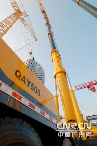 還有一個(gè)明星產(chǎn)品,就是QAY500噸全路面起重機(jī),從型號(hào)上就可以看得出,這臺(tái)起重機(jī)可以吊起重達(dá)500噸的東西。這是目前我國(guó)自主研發(fā)的最大噸位的汽車起重機(jī)。據(jù)徐工方面的技術(shù)人員介紹,徐工是國(guó)內(nèi)唯一掌握全路面起重機(jī)這一國(guó)際尖端產(chǎn)品設(shè)計(jì)制造技術(shù)的企業(yè),這臺(tái)起重機(jī)結(jié)合多項(xiàng)國(guó)際先進(jìn)技術(shù)于一身,采用了徐工29項(xiàng)專利技術(shù)。