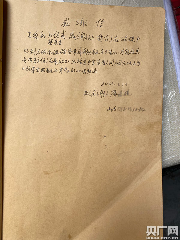 病人家屬手寫的感謝信(央廣網(wǎng)記者 謝元森 攝)