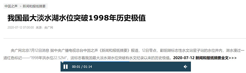 中國之聲《新聞和報紙摘要》報道:我國最大淡水湖水位突破1998年歷史極值