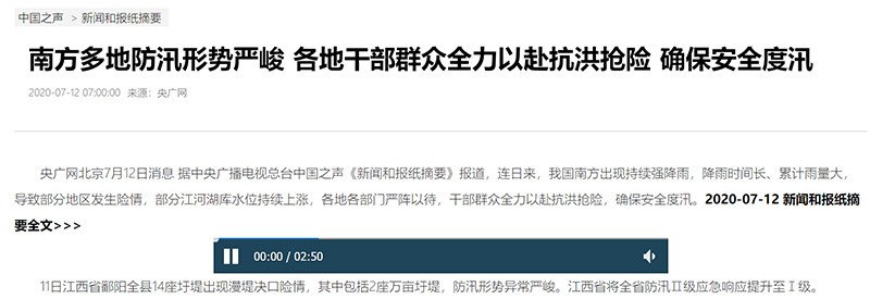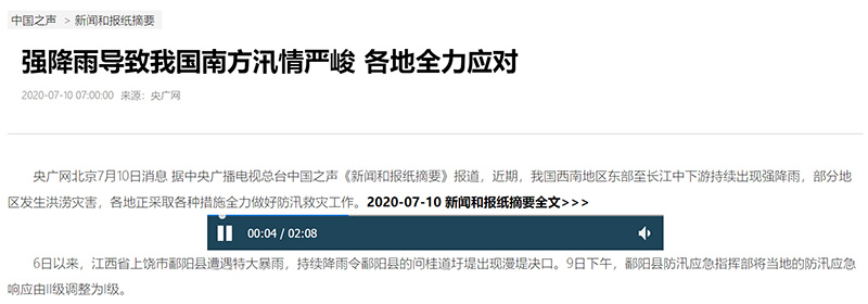 中國之聲《新聞和報紙摘要》報道:南方多地防汛形勢嚴峻 各地干部群眾全力以赴抗洪搶險 確保安全度汛