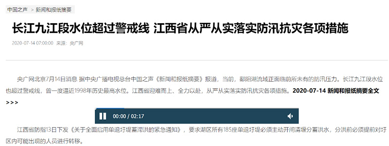 中國之聲《新聞和報紙摘要》報道:長江九江段水位超過警戒線 江西省從嚴從實落實防汛抗災各項措施