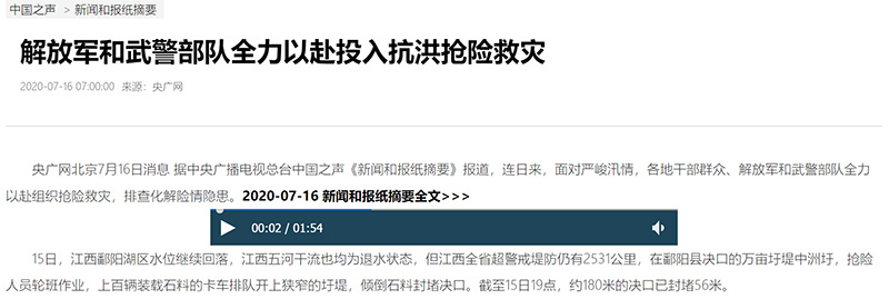 中國之聲《新聞和報紙摘要》報道:解放軍和武警部隊全力以赴投入抗洪搶險救災