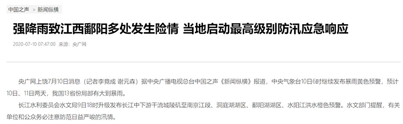 中國之聲《新聞縱橫》報道:強降雨致江西鄱陽多處發(fā)生險情 當?shù)貑幼罡呒墑e防汛應急響應