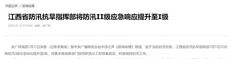 中國之聲《新聞和報紙摘要》報道:江西省防汛抗旱指揮部將防汛Ⅱ級應急響應提升至Ⅰ級