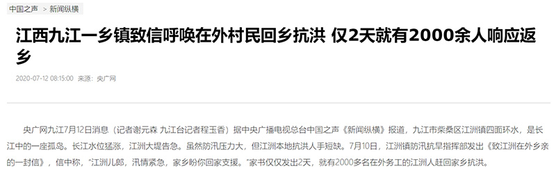 中國之聲《新聞和報紙摘要》報道:江西九江一鄉(xiāng)鎮(zhèn)致信呼喚在外村民回鄉(xiāng)抗洪 僅2天就有2000與人響應返鄉(xiāng)