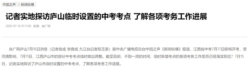 中國之聲《新聞縱橫》報道:記者實地探訪廬山臨時設置的中考考點 了解各項考務工作進展