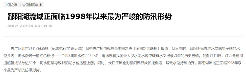 中國之聲《新聞和報紙摘要》報道:鄱陽湖流域面臨1998年以來最為嚴峻的防汛形勢