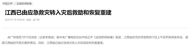 中國之聲《全國新聞聯(lián)播》報道:江西已由應急救災轉(zhuǎn)入災后救助和恢復重建