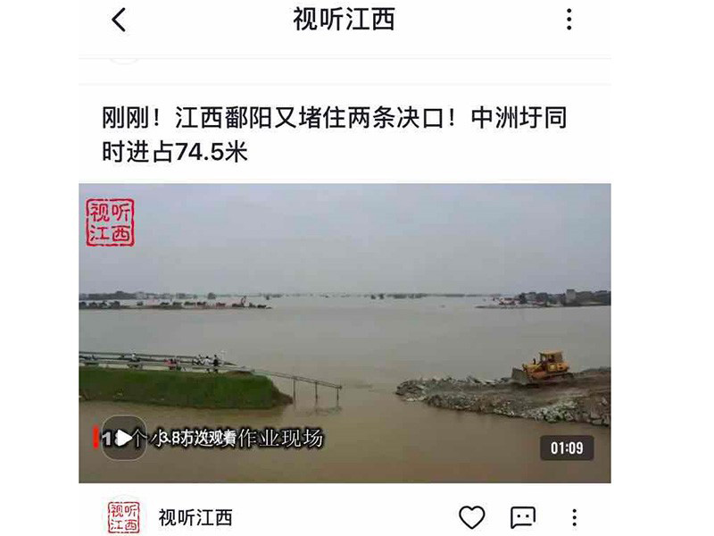 央視頻“視聽江西”報道:江西鄱陽又堵住兩條決口!中洲圩同時進占74.5米