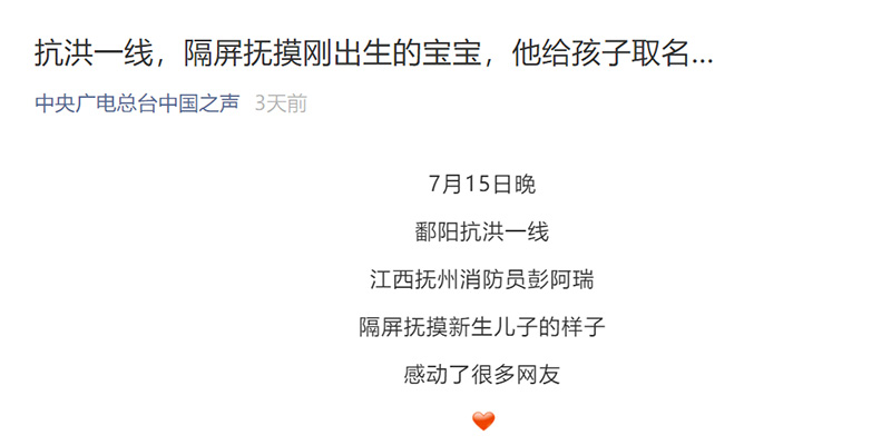 總臺中國之聲微信公眾號報道:抗洪一線,隔屏撫摸剛出生的寶寶,他給孩子取名…